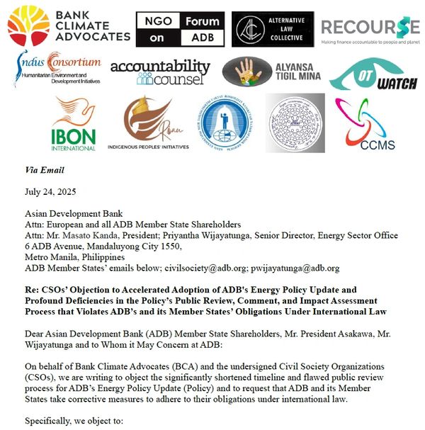 Click Here for BCA's and 13 CSOs' July 24, 2025 Climate Change Comments on the Legal Deficiencies in ADB's 2025 Energy Review Process Comments Object to the Accelerated Adoption of ADB's Energy Policy Update and the Profound Deficiencies in the Policy’s Public Review, Comment, and Impact Assessment Process that Violates ADB’s and its Member States’ Obligations Under International Law.