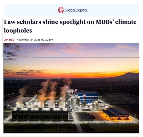 Two legal scholars have written a detailed opinion, affirming that multilateral development banks - and governments acting as their shareholders - are obliged under international law to make every effort to avoid financing development projects with high greenhouse gas emissions. This duty requires them to use the “best available science” to assess the climate impacts of projects, which essentially means excluding fossil fuel investments in all but exceptional cases, the opinion argues. The 44 page document was sent on November 13 to the Asian Development Bank and four days later to the International Finance Corp and World Bank, as part of a multi-year campaign by NGOs to stop them financing climate-harming infrastructure such as gas-fired power stations and liquefied natural gas terminals, which can prolong the use of fossil fuels. Over 20 NGOs and NGO alliances, led by San Francisco-based Bank Climate Advocates, have also sent the opinions to all the executive directors on the MDBs’ boards who represent their member countries...